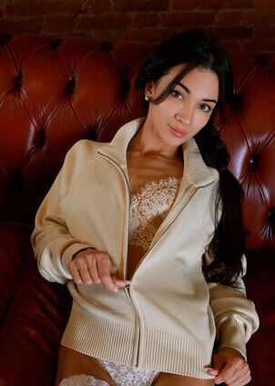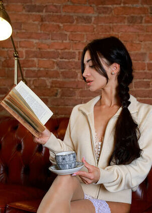 Candice is a brunette with really long curly hair that is in braids and she has painted nails. She starts her Met Art gallery inside a room on a red leather couch. She is wearing a cream jacket and a white lace bra and panties. Candice is stripping slowly while she is drinking tea and teasing people with her thigh- stockings. She is spreading her legs wide to show her shaved pussy. Candice is playing with her hair and a gold lamp. Her earrings are shining in the room that has brick walls. Candice does some explicit things. She lies back on the couch with her legs spread wide. She is rubbing her clit with her fingers. She is holding the lamp to her chest. Candice is also riding the edge of the couch with her ass raised and her pussy is glistening. The gallery has twenty one images of Candice. It ends with her kneeling on the couch. Her fingers are deep in her pussy and her thighs are trembling. Candice is moaning into the light of the lamp. Finally Candice is lying flat on her back. Her legs are wide apart. There is juice under her ass. She is staring at the camera. She has a satisfied grin, on her face.