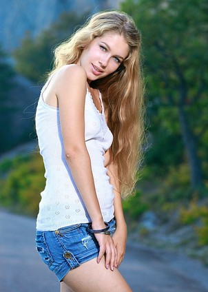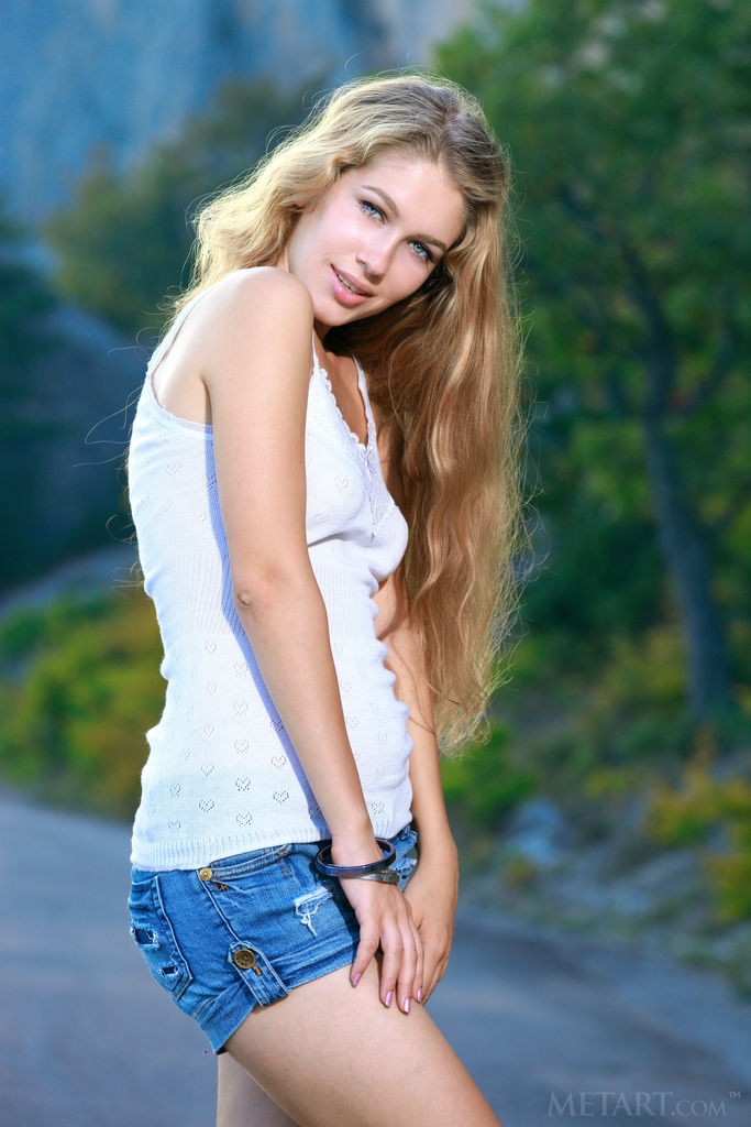 Blonde goes for a walk in shorts but undresses very soon