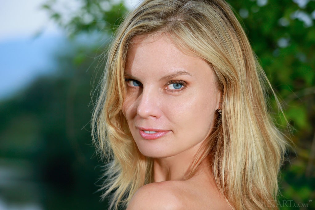 Cute blonde teen enjoying a naked photo shoot on the lake