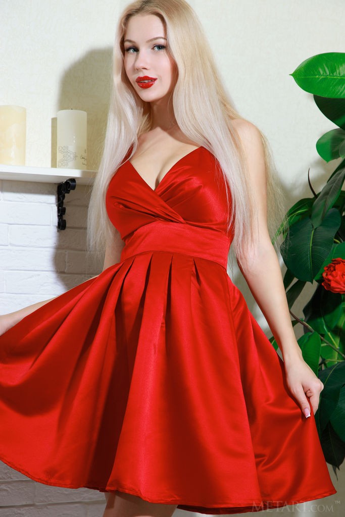 Glamorous blonde MILF hottie posing in an elegant dress